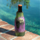 This bottle cooler features a pretty image of a bumble bee gathering nectar from a purple thistle.