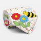 A cute yellow and black bumble bee with red hearts and red and blue flowers. Beautiful summer garden graphic illustration. Bright colors with the slogan/ saying "Bee Love" (Be Love) play on word.