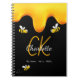 A stylish black background and happy smiling bumble bees. Decorated with sweet, golden honey dripping. Personalize and add your name, monogram initials, and a title. Golden and white letters. The name is written with a hand lettered style script.