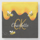 A black background and happy smiling bumble bees. Decorated with sweet, golden honey dripping. Personalize and add your name and monogram initials, golden and white letters. The name is written with a hand lettered style script. Perfect for your summer home!