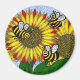 A magnet with three funny bumblebees buzzing around bright yellow and orange sunflowers.