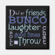 Get your favorite friends together and have a Bunco or Bunko game night. I've created for you a fun modern typography fun Bunco themed design in blue and purple colors. Black background to make the design pop! Perfect for all of your Dice Friends and makes a great Bunco prize or gift.
