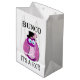 Fun and festive gift bag for Bunco prizes. Bunco It's A Hoot features a colorful and stylish pink owl complete with a pink top hat and pink feather. Bunco gift bag is great for holiday gift exchanges or for a Bunco gals birthday gift.