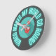 Those that love the game of Bunco will love this retro inspired design with red dice on a turquoise center, neon aqua "Bunco makes my world go round" text on dark chalkboard gray background.