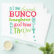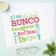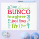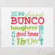 Fun multicolor subway art graphic bunco design. Background color can be changed. Featured are the words friends, bunco, dice, throw, toss, chat, laughter and good times. Makes a great and clever prize or gift. Great for your next Bunco event. Use as a paper place mat for your Bunco events.