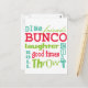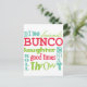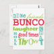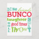 Fun multicolor subway art graphic bunco design. Background color can be changed. Featured are the words friends, bunco, dice, throw, toss, chat, laughter and good times. Makes a great and clever prize or gift. Great for your next Bunco event.