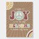 Neutral baby shower theme featuring "Bundle of Joy" text with peace sign incorporated into design. Rainbow stripes at right and sunshine at bottom left with cardstock inspired sunburst background.