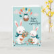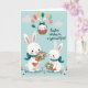 This design shows a soft pastel blue sky-like background with a thin border, setting a gentle spring scene 🌷. Three stylized white rabbits with rounded shapes and rosy cheeks take center stage, with two larger ones in the foreground wearing teal bows. The left rabbit extends a loose bouquet of coral and white flowers toward the other, like a friendly offering, while the right rabbit holds a smaller bouquet close, their eyes meeting in a tender, affectionate glance 🐰. Above them, a smaller rabbit peeks from a woven basket floating among puffy white cloud shapes, adding a light, airy touch. A cluster of balloons in coral, sunny yellow, and deep teal lifts the basket upward, balancing the scene with warm pops of color. Small scattered blossoms dot the lower area, grounding the rabbits on the “ground” while the floating basket drifts overhead. On the right side, a short greeting appears in slender lettering, set in a darker teal tone that stands out against the pale background. The balloons sit just above the basket, with strings trailing down near the little rabbit’s paws.