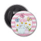 Bottle openers to commemorate an event, with a pink and white striped background. A white circular frame with a pink border layered over top with your personalized text inside. Inside the frame an illustration a mom and baby bunny standing together. Yellow daisies in the background. Whimsical butterflies fluttering about.