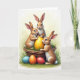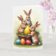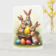 This design shows three rabbit-like animals gathered in fresh spring grass, arranged around a rustic woven basket as if they’ve stumbled on a shared secret 🐰. One larger bunny with light brown fur stands on the basket rim, gazing upward while the two smaller companions lean close together below, their pink-lined ears nearly touching in a tender, friendly huddle. Between them, they cradle an oversized golden egg that glows softly, its warm shine reflecting in their wide eyes and gentle poses. Loose green blades spill from the basket and frame the scene, adding texture and a cozy, outdoorsy setting. The background fades into a misty blend of pale yellow and light green, like early morning light filtering through a meadow 🌷. Near the bottom area, the greeting “Happy Easter” appears in a soft pastel tone and sits centered beneath the basket. Three smaller eggs—one blue, one orange, and one red—rest in the grass below the basket, each a solid color with smooth, simple shading.