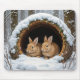 Two rabbits sit snugly inside a wooden log covered with snow in a wintry forest setting