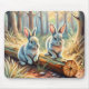 Two rabbits are perched on a fallen log in a vibrant, forested setting with warm light filtering through the trees