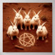 Cute 'lil white bunnies with their pentagram drawn in dirt. Satanic? Who knows what they're up to? They do look a bit wicked. A perfect thing for the living room in the right home. Or give as a gift to someone who loves both rabbits and the occult.