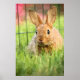 This is a watercolor rendering. It shows a brown rabbit among the grass with a fence on the background.