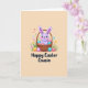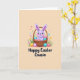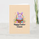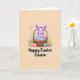 This card features a lavender bunny 🐰 with wide, shiny eyes, rosy cheeks, and a tiny tongue peeking out, set against a soft peach background that feels sunny and gentle. The bunny sits snugly in a woven rustic basket, leaning forward as if posing sweetly for someone close. Around it, glossy oval eggs in teal, fuchsia, and golden yellow add bright pops of color, with a few decorated in simple stripes. Small floating hearts hover above the bunny, suggesting a tender, affectionate moment without needing to say a word. Tufts of green grass and little star-shaped flowers in pale lilac, sky blue, and soft yellow frame the basket like a spring garden 🌷. Near the bottom, rounded lettering in a darker contrasting shade is centered and easy to read, presenting a seasonal greeting aimed at a cherished relative. The basket’s weave is shown with fine crosshatching, and the eggs catch the light with tiny highlights along their curved tops.