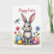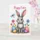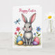 This card features a soft gray bunny with a fluffy chest, big shining eyes, and rosy cheeks, sitting calmly as if waiting for a friend 🐰. Around it, spring flowers in pink, yellow, and blue cluster close like a small bouquet offered with quiet affection, with green stems curling through the scene 🌷. Near the bunny’s paws, painted egg shapes are arranged like shared treats: a bright blue one beside a smaller orange one, plus a patterned pink and a deep purple nearby. In the upper left, a tiny blue-winged insect floats in, adding a gentle, natural touch to the open space. The lighting stays soft and even, giving the bunny’s fur a tender look and making the colors feel inviting without being loud. Across the top, a friendly greeting appears in fuchsia lettering, centered above the bunny and standing out against the white background. The background remains plain white, while the flowers and eggs form a colorful ring around the seated bunny and the blue-winged insect hovers near the top-left corner.