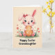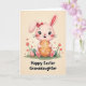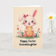 This card features a friendly, human-like bunny in soft powdery pink, with rosy cheeks, bright eyes, and a small red bow that adds a sweet, affectionate touch 🐰. Set against a warm creamy beige background, the bunny hugs an oversized decorated egg close to its chest, as if sharing a quiet moment with someone special. The large egg is covered in white and pink floral shapes with scattered heart motifs, and a few tiny red hearts float nearby to hint at romance or close friendship. Below, stylized green grass holds a mix of smaller eggs—some striped, some solid—tucked in like little surprises among the blades. Slender red flowers rise from the grass, adding gentle contrast and guiding your eye back toward the bunny and its cherished egg 🌷. A short greeting appears near the bottom in dark lettering, centered and easy to read against the light background. The illustration uses rounded shapes and soft shading so everything looks smooth and softly lit. The bottom area shows the dark text beneath the bunny, with green grass, red flowers, and small patterned eggs lined along the lower edge.