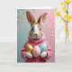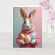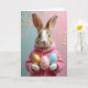 At the center of the card is a close-up of an animal-like rabbit with mottled brown-and-white fur, dark shiny eyes, and a small pink nose, looking straight ahead with a gentle, inviting gaze 🐰. It wears a ribbed pink sweater with a buttoned front, and its fluffy white paws peek from the sleeves as they cradle three smooth egg shapes. The eggs are decorated in soft pastel tones: one gold with a subtle gleam, one rose pink with tiny metallic flecks, and one sky blue with similar speckles. Soft lighting creates a cozy glow across the fur and knit texture, and the rabbit’s calm expression suggests a sweet, affectionate moment, like it’s offering the eggs to someone special 🌷. A short Easter greeting sits near the top in light lettering, standing out against the pale background without overpowering the portrait. The background fades from dusty rose to light teal, dotted with blurry golden sparkles that echo the egg decorations. Behind the rabbit, the gradient wash and scattered golden bokeh form a gentle halo around its head and shoulders.