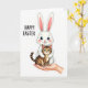 This card features a white background that makes the central characters stand out right away. A fluffy white bunny-like animal with very long ears, pink cheeks, and big blue eyes holds a smaller cat close, and their faces tilt toward each other with a tender, friendly closeness 🐰. The cat has a striped coat in caramel and deep brown, with green-gold eyes that look up with quiet trust. Below them, a human hand supports both animals, and the neatly manicured nails add a careful, caring touch to the scene. Soft shading along the fur and rounded shapes gives the pair a plush, gentle look without heavy detail. In the upper left corner, the words “HAPPY EASTER” appear in thick uppercase letters, set in a dark tone that contrasts clearly against the white space 🌷. The lighting stays bright and even, leaving no shadows behind the characters. The bunny’s ears rise high above its head while the cat’s striped tail curves inward near the supporting hand.