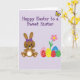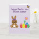 This card features a soft lavender background with a lightly textured edge, setting a gentle spring scene 🌷. On the left stands a stylized brown bunny 🐰 with tall ears, a purple bow between them, wide eyes, and two front teeth that give it a sweet, friendly look. The bunny faces slightly right, as if sharing a quiet moment with the decorations beside it. To the right sits a row of five decorated eggs in mixed colors, each with a different pattern like stripes, crosses, and looping lines. Rising from the eggs is a single pink flower with a yellow center and green leaves, leaning upward like it’s being offered as a small sign of affection. Near the top, a short message in purple text is centered above the scene, easy to spot against the lavender background. In the upper right, a small bright yellow winged insect hovers, angled toward the flower.