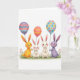 This design shows four stylized bunnies 🐰 standing side by side on a thin strip of green grass sprinkled with small pink-red flowers, set against a plain white background. One bunny is golden yellow, two are creamy white, and one is soft lavender, each with big eyes, tiny smiles, and rosy cheeks that make them look like close friends sharing a sweet moment. Each bunny holds a balloon string, and the balloons are egg-shaped like festive decorations, floating above them as if they’ve just gathered for a springtime stroll 🌷. The left balloon has chevron stripes in lilac, teal, and soft coral, while the next balloon is pink with horizontal bands of coral and bright yellow. The third balloon is bright blue with orange and pink polka dots, and the right balloon returns to a chevron pattern with a different mix of colors to keep the row varied. There’s no heavy background scene, which keeps attention on the tender way the bunnies face forward together, close enough to feel like a shared celebration. Any text sits high above the characters in a simple, medium-weight style, colored in a soft spring tone that doesn’t overpower the artwork. The balloons appear crisp and glossy compared with the softer, watercolor-like texture of the bunnies and the grass beneath their feet.