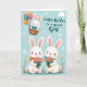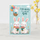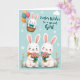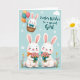 Designed with a pale blue background sprinkled with tiny star-like dots and a single puffy cloud, this card features three fluffy white bunny characters in a sweet spring scene 🌷. In the upper left, one bunny with pink-lined ears and rosy cheeks rides in a woven basket, lifted by a bunch of pastel balloons in yellow, pink, teal, and soft gray. A small teal bow sits at its neck, echoing the balloon colors and adding a gentle, friendly touch. Below, two matching bunnies stand close together, angled toward one another with a tender, sharing look that feels like quiet friendship 🐰. One wears an orange bow and the other a teal bow, and each holds a bouquet of pink and golden-yellow flowers tied with teal ribbon as if offering them to someone special. Slender green stems with tiny blossoms rise along the sides, framing the pair and hinting at early spring. In the upper right, the phrase “Easter Wishes to a special Girl” appears in deeper teal lettering, neatly spaced against the sky-toned background.