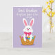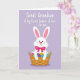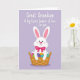 This design shows a muted lavender background that sets off a stylized white hare with tall upright ears and soft pink inner ear details 🐰. The hare’s rounded cheeks carry a light blush, and a tiny heart-shaped pink nose adds a sweet, affectionate touch to its face. Around its neck sits a bright pink bow, like a little gift accent that hints at a close bond and a gentle, caring exchange. The hare is tucked into a woven basket in warm earthy browns, with crosshatch lines suggesting the texture. All around the basket are decorated eggs in blues, greens, yellows, and deep pinks, covered in stripes, dots, and curling swirls 🌷. Near the top, a short greeting in flowing white lettering is centered and easy to spot against the lavender. The basket rim curves upward with the eggs peeking out at different angles, creating a full, layered look.