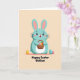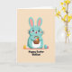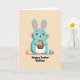 This card shows a cheerful, human-like bunny standing front and center on a light peach background, bringing an easy, friendly warmth 🐰. The bunny is teal with rounded ears tipped in soft pink, and its cheeks carry a faint blush that pairs with its wide, bright-eyed grin. In its paws, it holds a woven basket close to its belly, like it’s offering a small treat to someone it cares about. Inside the basket sit decorated eggs in pink, yellow, and blue, along with a single orange carrot tucked to one side. Two extra eggs sit nearby—one golden yellow with small white dots and another teal with a speckled finish—adding a cozy, shared-celebration feel 🐇. Along the bottom edge, a short greeting appears in dark lettering, centered and easy to read against the pale background. Soft, even lighting keeps the colors gentle, with smooth outlines and minimal shadowing. The bunny’s ears curve upward with pink tips, and the basket weave is shown with small, tidy crosshatched lines.