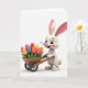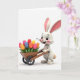 Designed with a white bunny character shown mid-step, pushing a rustic wooden wheelbarrow across a bright white background 🐰. The bunny has long ears with pink inner details, wide eyes, and an open smile with rosy cheeks that reads like it’s bringing flowers to someone it cares about. Its rounded shape and small fluffy tail look smooth and polished, giving the figure a cute, storybook-like presence. Positioned slightly to the right, the bunny guides your gaze toward the wheelbarrow brimming with tulip-like blooms, as if delivering a friendly surprise 🌷. The flowers fill the cart in reds, yellows, pinks, oranges, and blues, with petals kept simple and evenly colored against the muted brown wood. There is no visible text on the design, leaving plenty of open space around the character and flowers. The wheelbarrow has dark, minimal wheels, and the bouquet rises high above the rim in a dense cluster of rounded petals.