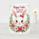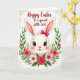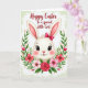 Designed with a sweet spring scene, this card features an upright, human-like rabbit centered in the artwork 🐰. The rabbit has smooth cream fur, large dark eyes with fine lashes, and a soft blush on its cheeks, giving it a tender, friendly look as it faces forward. A bright fuchsia bow sits on one raised ear, adding a flirty touch that feels like a small gift between close friends. Surrounding the rabbit is a balanced floral wreath of stylized blossoms in light pink and deep red, tucked among fresh green leaves that curl inward like an embrace 🌷. At the bottom of the wreath, a richly colored red rose anchors the arrangement and draws the eye. Near the top, a flowing greeting appears in crimson lettering, arcing above the rabbit and framed by the flowers. The background is white with a faint, pale green watercolor edge that softly fades around the border.