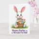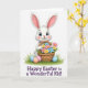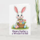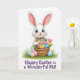 This card features a white, human-like bunny with fluffy fur, bright blue eyes, rosy cheeks, and a gentle smile that feels friendly and a little romantic 🐰. The bunny stands upright with long ears lined in soft pink, leaning in as if sharing a quiet moment with the viewer. It holds a woven basket close to its chest, and the basket is filled with pastel flowers in pink, yellow, and light blue, like a spring bouquet offered to someone special 🌷. Near the bottom, a patch of dewy green grass frames three decorated eggs in soft blue, orange-striped, and mottled purple. The background stays plain white, keeping the bunny and flowers front and center under smooth, even lighting. Below the illustration, a rounded line of purple text sits centered along the lower margin, reading as a short Easter greeting. Fine details show in the basket’s weave and the small blades of grass around the eggs.