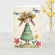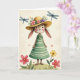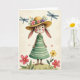 This card features an upright rabbit-like character 🐰 standing against a soft creamy background with a gentle smile, rosy cheeks, and dark, attentive eyes that feel like they’re meeting a friend’s gaze. A wide-brim straw-colored hat sits neatly on its head, crowned with pink and violet flowers and fresh green leaves that suggest an affectionate, springtime moment. The figure wears a teal-green dress with horizontal white stripes, a lightly ruffled collar, and small golden buttons that add a sweet, tidy touch. Near the top, brief Easter words appear in a simple style, set in a muted pastel tone and placed slightly above the character’s hat. Two small winged insects in soft blues hover overhead, balanced on either side like they’re circling in a quiet dance 🐇. Beneath, the character stands on a gently rolling grassy mound, with large red and sunny yellow blossoms framing the lower corners. Scattered, muted floral shapes dot the background, and the hat’s flower bouquet shows layered petals in pink and violet with green leaves fanning outward.