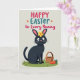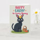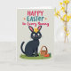 This card features a digital illustration of a dark-furred bunny with long ears lined in soft pink, a yellow flower resting on its head, and wide eyes that feel like a friendly, affectionate hello 🐰. The bunny sits neatly on a bright green patch of grass, its small smile suggesting it’s waiting to share a sweet moment with someone close. To the right, a brown woven basket and an orange carrot sit side by side, like a little offering left for a friend. The background stays a muted off-white, keeping the focus on the bunny and the spring colors 🌷. Across the top, the text reads “HAPPY EASTER to Every Bunny,” with “HAPPY EASTER” in coral pink and “to Every Bunny” in lively teal with warm orange accents. The lettering is centered above the scene, with the words stacked to fill the upper space without covering the character. Soft shadows sit under the grass, basket, and carrot, and the bunny’s ears tilt slightly forward with the flower angled to the left.