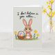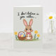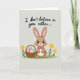 This card shows a brown bunny character centered on a light taupe background, looking straight ahead with big glossy eyes that feel a little teasing and a little sweet 🐰. Its tall ears point up with rosy pink inner fur, and a small pink bow at the neck adds a dressed-up touch that hints at a friendly, flirty mood. Simple yellow flowers on thin green stems sit on both sides, like they’re framing the bunny the way friends might gather close for a photo 🌷. On the left, a woven basket rests near the bunny, filled with pastel eggs in soft pink, purple, yellow, and blue. Across the top, the message “I don’t believe in you either...” appears in flowing cursive-style lettering in a dark tone that stands out clearly against the pale background. A narrow band of green leaves runs along the bottom edge, grounding the scene like a small patch of grass. The bunny’s pink nose and the tiny highlights in its eyes are carefully drawn, with the basket’s weave lines and the egg colors adding gentle detail nearby. The blossoms are flat yellow shapes with small centers, and the green stalks rise neatly beside the bunny’s shoulders.