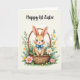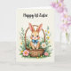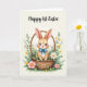 This card features a fluffy young rabbit 🐰 with light brown fur painted in gentle strokes, sitting snugly in a rustic woven basket as if it’s been carefully tucked in by a close friend. Its large, attentive eyes and softly blushed cheeks give it a tender, affectionate look, and the inner ears are a warm pink. A bright blue bow rests at its neck, adding a sweet touch that feels like a thoughtful gift. Around the basket, fresh green leaves and thin stems curl upward, creating a cozy spring setting. Soft pink five-petaled blossoms, tiny yellow buds, and a single white daisy-like flower 🌷 are scattered among the greenery. The background stays a smooth cream tone, keeping the focus on the rabbit and flowers. Near the top, a short line of text sits centered in a dark gray, hand-drawn look, floating above the basket and foliage.