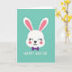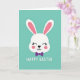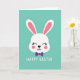 This card features a white bunny face centered on a smooth teal background, with rounded shapes that keep the look simple and easy on the eyes 🐰. The tall ears show soft pink inner details, and the bunny’s closed eyes with tiny lashes give it a calm, affectionate expression, like it’s leaning into a sweet moment. Light rosy circles on the cheeks add a gentle blush that suggests closeness and warmth between friends. A small dark nose shaped like an upside-down heart sits above a neat, curved mouth. Just below the chin, a purple bow tie adds a dressy touch and a hint of date-night charm. Near the bottom, a short Easter greeting appears in white lettering, centered and spaced to stand out clearly against the teal field 🌷. The overall layout leaves plenty of open space around the bunny, with the bow tie and greeting aligned beneath the face.