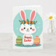This design shows a sweet, upright bunny character in the center, mostly white with soft pink inside the long ears and on the round cheeks, giving it a tender, friendly look 🐰. Its wide dark eyes and small smile feel like it’s quietly sharing a warm moment with the viewer, like a gentle friend leaning in. A floral crown sits on its head, made of orange blossoms, leafy greens, and a few brown twigs woven through. Behind the bunny is a large teal-blue circle sprinkled with tiny lighter dots, set over a pale background with diagonal stripes that adds depth through soft shadowing. On either side sit two large decorated egg shapes, placed like cheerful companions framing the bunny 🐇. The left egg has horizontal stripes in green, orange, and golden yellow with small dotted accents, while the right egg alternates sunny yellow and rosy pink bands with simple flower shapes. Across the bunny’s rounded torso, a seasonal greeting appears in red letters centered and easy to read. The teal circle, dotted specks, and striped backdrop sit neatly behind the bunny and the two patterned eggs.