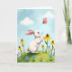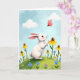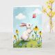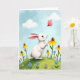 This card features a plush white rabbit 🐰 resting on a gently sloped green hill sprinkled with spring wildflowers. The rabbit has soft-looking fur, pink inner ears, and rosy cheeks, and its tender gaze shifts between a tall yellow bloom and a small pink butterfly drifting nearby. Around the rabbit, green grasses mix with tiny blossoms in blue, purple, and orange, creating a cozy garden scene that feels like a quiet moment shared with a friend. A light blue sky stretches overhead with a few fluffy white clouds, and the soft glow across the scene gives everything a gentle, affectionate warmth. Near the top, a short Easter greeting appears in a simple, easy-to-read font, set in a light pastel tone that stands out against the sky, with a smaller line of text centered beneath it. The layout keeps the words airy and unobtrusive so the rabbit and butterfly remain the focus, like two companions meeting in the same calm breeze 🌷. The rabbit’s paw reaches toward the sunlit yellow flower while the pink butterfly hovers just above it against the pale blue sky.