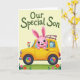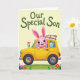 This greeting card shows a cheerful, human-like bunny leaning out of a sunny yellow car, grinning wide with dark sparkling eyes, long lashes, and pink ears held high 🐰. The bunny’s gentle tilt and eager posture suggest it’s rushing toward someone it cares about, like a friend meeting you at the curb with a happy little surprise. The background is a soft creamy yellow at the top, fading into a grassy green band along the bottom, setting the scene outdoors among simple flower shapes. Across the upper area, a curving line of green lettering sits prominently against the pale sky, easy to spot without crowding the art. Along the green ground, small blossoms in red, pink, and purple are scattered like a path the car just rolled through 🌷. A roof rack tops the car, adding a small travel detail that makes the moment feel like a shared outing. Each wheel is decorated with a pinwheel-like swirl of many colors instead of a standard hubcap.