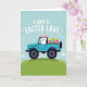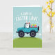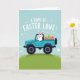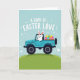 This greeting card shows a white bunny driving a turquoise open-top car, smiling softly as if heading to meet someone special 🐰. The bunny’s tall ears have pink inner details, and its relaxed posture suggests friendly confidence and a sweet, caring mood. In the back of the car sits a piled stack of decorated eggs, each covered in stripes, zigzags, and wavy lines in yellow, green, pink, blue, orange, and purple 🌷. The background is a pale blue sky dotted with small white heart shapes that float above the scene like quiet little signals of affection. A rounded green hill curves along the bottom, keeping the setting simple and springlike. Near the top, the words “A LOAD OF EASTER LOVE” appear in white, set in a clear, easy-to-read style against the blue sky. The car is angled as if rolling across the hill, with the colorful eggs rising above the back seat in a neat, cheerful mound.