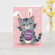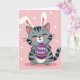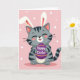 This card features a round grey cat with oversized white bunny ears tipped with pink, centered on a soft pastel pink background 🐰. The cat’s eyes are gently closed, cheeks blushed, and smile wide, as if sharing a private joke with someone close. It hugs a large purple egg-shaped decoration with gold bands, holding it snugly against its chest like a small gift meant for a friend. Across the egg, white lettering sits in the middle as the main message, standing out clearly against the purple. The background is sprinkled with soft white circles that look like floating confetti, adding a light, affectionate energy. Warm pinks and cool greys balance each other while the purple and gold create a rich contrast, and a small 🌷 detail can be tucked near the lower area for extra spring charm. The bunny ears rise above the cat’s head, curving outward with pale pink inner shading.