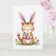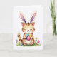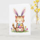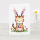 Designed with a sweet spring scene, this card features a caramel-and-cream tabby cat sitting calmly with oversized bunny ears lined in soft pink 🐰. The cat’s eyes are closed and its small smile, warmed by rosy cheeks, suggests a tender, affectionate mood, like it’s savoring a quiet moment with someone close. Nestled in its front paws is a cluster of four decorated eggs, each one a different color—teal, purple, yellow, and pink—with tiny polka-dot details. A few stylized wildflowers in bright tones dot the area around the cat, adding little bursts of color without crowding the scene 🌷. The background stays mostly white, with a hint of green ground beneath the character to anchor everything. A short Easter greeting sits near the top in soft pastel lettering, while a smaller line of text is placed near the bottom in a matching light color. The bunny ears rise high above the cat’s head, their pink inner panels gently shaded against the white backdrop.