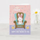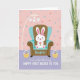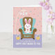 This design shows a stylized white bunny with soft pink inner ears and matching paw pads sitting calmly on a cushy armchair in aqua with warm brown accents, wearing a small pink bow and holding a tiny pink flower 🐰. The bunny’s gentle posture and the way it cradles the flower suggest a tender, affectionate mood, like it’s waiting to share a quiet moment with a friend. Behind it, the upper background is light pink with scattered polka dots in sky blue, blush, and teal, giving the scene a light, festive look. A smooth lavender floor stretches across the bottom, keeping the layout grounded and cozy. From the left side, a curved hanging arm extends inward and suspends three small white bunny figures, as if they’re drifting above the chair like a sweet daydream 🐇. On both sides of the armchair, yellow-striped woven baskets are filled with decorated eggs in assorted colors and patterns, adding variety and seasonal detail. A short Easter greeting appears near the top in rounded lettering, set in a soft teal tone against the pink background, with smaller accent words tucked nearby in pink. The eggs show stripes, dots, and zigzags in mixed bright shades, nestled high in the baskets beside the chair.
