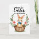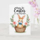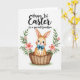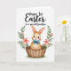This card shows a light brown, humanlike bunny peeking out of a rustic woven basket, its big blue eyes turned upward with a tender, friendly look 🐰. The bunny’s gentle smile and slightly tilted head give the scene a soft, affectionate tone, as if it’s greeting someone it cares about. A neat blue bow sits under its chin, adding a sweet, dressed-up touch without feeling formal. Around the basket, slender green leaves curl among bright pink five-petaled flowers and small white daisies with warm golden centers, creating a spring garden border 🌷. Near the top, a congratulatory line appears in flowing lettering, centered above the illustration in a dark ink color that stands out against the white background. The open white space keeps everything airy, letting the rabbit’s fur tones, the blue bow, and the pink blossoms draw the eye. Beneath the basket, a faint pale-green wash spreads lightly across the lower area, as if grass is softly brushed in behind the weave. The basket’s curved texture is shown with tan and brown strokes, and a few leaves overlap its rim.