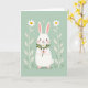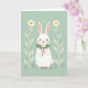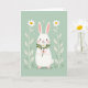 This card shows a white, rabbit-like character standing calmly in a lush green setting, with a gentle, friendly look that feels like a quiet hello between close friends 🐰. The background is a muted sage green, letting the character’s white fur stand out, while dot eyes, a small red nose, rosy cheeks, and a soft smile add a tender, affectionate tone. Long ears with pale pink inner details rise above its head, giving the figure an easy, open posture. In its small paws, it holds a white daisy with a bright yellow center, like a simple offering meant for someone special 🌷. Two tall leafy stems frame the character on both sides, each topped with a matching daisy, creating a balanced garden scene. Near the bottom, small green sprigs and tiny red-accented flowers fill in the ground, and a few pink heart shapes float nearby to suggest warm connection. There is no text, leaving the soft greens, crisp whites, and pink accents to carry the design, with the daisies’ yellow centers catching the eye against the deep green leaves.