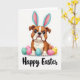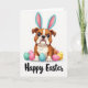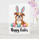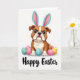 This card features an animated-style bulldog-like dog in the center, wearing oversized bunny ears with pink and teal inner panels, giving a slightly reluctant look that still feels affectionate 🐰. Its warm russet-brown fur has creamy patches and a soft shine, and the raised brow over big dark eyes suggests a teasing, friendly bond with the viewer. Around the dog’s sturdy body sit several glossy oval eggs in pale pink, gentle teal, and sunny yellow, arranged like they’ve been set out for a shared springtime moment. Some eggs have small polka dots while others show simple stripes, adding a light, flirty rhythm to the scene without crowding it. The background stays bright white so the character and eggs stand out clearly, like they’re posing together in a quiet, open space. Near the bottom, the greeting “Happy Easter” appears centered in flowing cursive-style lettering, set in a dark tone that contrasts with the white space above. A small 🌷 touch comes through in the soft pastel palette and the way the eggs nestle close to the dog’s paws. The bunny ears tilt slightly upward, with the pink and teal interiors framed by a pale outer edge.