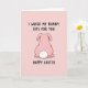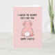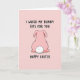 This card shows a plump, cartoon-style bunny-like figure in soft pastel pink, shown from behind at the center of a slightly lighter pink background 🐰. A dark outline traces the rounded body, giving it a crisp graphic look while keeping the scene gentle and sweet. The fluffy white tail is a neat, round puff that stands out like a soft little cloud, adding a teasing touch to the otherwise simple layout. Above the character, the main message “I WAXED MY BUNNY BITS FOR YOU” sits near the top in thick, hand-drawn black lettering, leaning into a cheeky, flirty tone that feels like an inside joke between close friends. Near the bottom, “HAPPY EASTER” appears in matching black text, centered to balance the design and set the holiday context 🌷. The tight color palette stays mostly pink with black accents and that bright white tail, keeping attention on the bunny and the words. The bunny’s rounded posture and the suggestive line of text create a coy, affectionate mood without needing any extra details. The background remains a smooth, solid field of pale pink with the black text above and below the centered bunny figure.