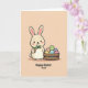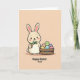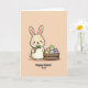 This card features a cream-colored bunny standing slightly turned, wearing a small green bow tie and holding an orange carrot out like a sweet offering 🐰. Its dot-like eyes and soft rosy cheeks give it a friendly look that feels like a gentle hello to someone close. Beside it sits a wooden basket filled with decorated eggs, each one showing stripes, dots, or wavy lines in pastel blue, green, yellow, orange, and purple 🌷. The simple peach background keeps everything calm and cozy, letting the bunny and eggs stand out without any busy scenery. Near the bottom, the words “Happy Easter Uncle” are placed as a neat line of text in a darker contrasting color for easy reading. The spacing around the lettering leaves plenty of breathing room, like the message is being offered with care. The bunny’s ears have soft pink inner details, and a small fluffy tail peeks out behind its rounded body.
