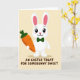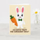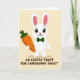 This card shows a white, upright bunny centered on the page, with big black eyes, rosy cheeks, and soft pink inner ears that give it a sweet, friendly look 🐰. A small dark green bowtie sits neatly at its neck, adding a dressed-up touch that feels like it’s ready for a springtime visit. The bunny holds up a large orange carrot with leafy green tops, as if offering a treat to someone it cares about. The background is a creamy beige that keeps the scene gentle and cozy, letting the character’s tender expression do the talking. Near the bottom, rounded lettering reads “Easter treat” above “for my sweet,” arranged in two lines and set in a dark tone that stands out clearly. The simple, flat shapes and minimal shading keep the focus on the warm gesture between giver and receiver 🌷. The carrot’s orange and greens pop against the pale backdrop, with the bowtie echoing the leafy color. The bunny’s paws wrap around the carrot just above the text, with the message centered beneath the figure.