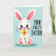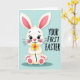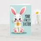 This card shows a stylized white rabbit seated slightly left of center on a light aqua background with a faint grid pattern, giving the scene a calm, airy setting. The rabbit’s rounded shape, rosy cheeks, and tiny pink nose make it look gentle and approachable, as if it’s pausing to share a sweet moment 🐰. Large eyes with fine lashes and a soft, attentive gaze suggest a tender, friendly mood, like it’s offering a quiet hello. Its long ears have pale pink inner details, echoed again in the small pink pads on its paws for a cozy, coordinated look. In its paw, the rabbit holds a single yellow flower with a deep pink-red center, angled forward like a small gift 🌷. On the right side, the words “YOUR FIRST EASTER” appear in dark lettering, set in a strong, flowing style that stands out against the pale background. The text sits to the right of the rabbit with generous spacing, keeping the layout open and easy to read. The flower’s round center is a saturated pink-red dot surrounded by bright yellow petals near the rabbit’s front paws.